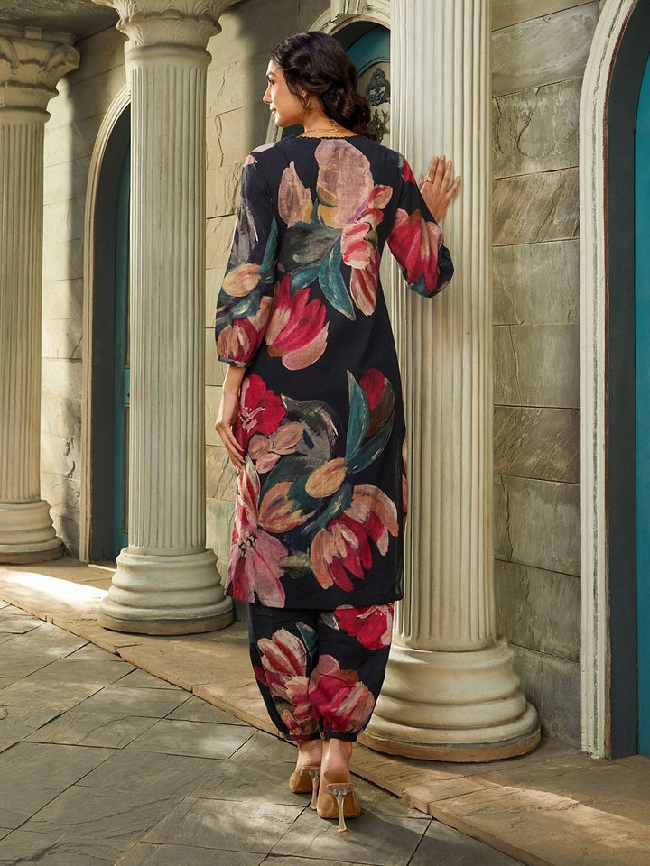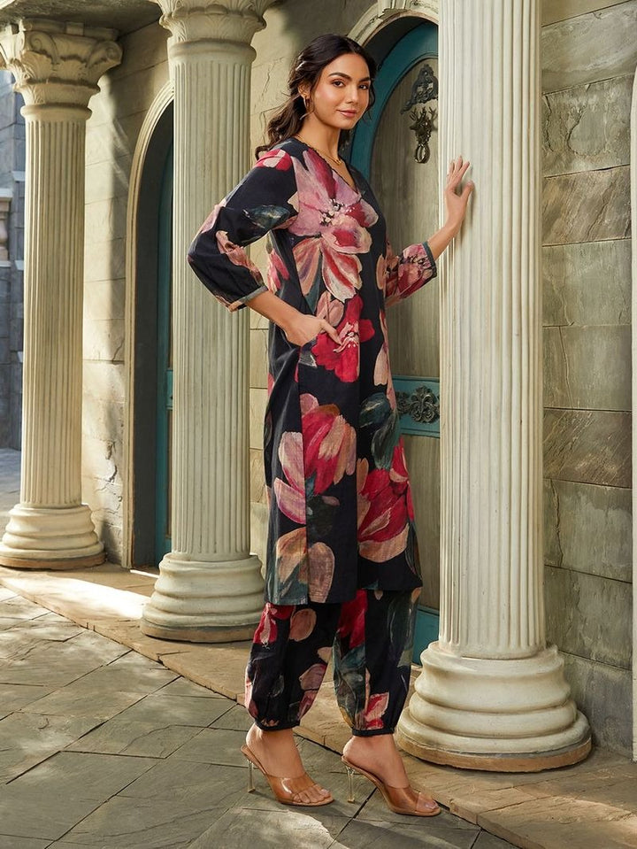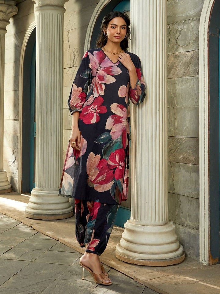 Midnight Bloom Co-ord Set, a captivating ensemble featuring a deep navy base adorned with oversized floral prints in rich hues of crimson, blush pink, and emerald. The kurta showcases a flattering V-neckline and three-quarter balloon sleeves, exuding both grace and modernity. Paired with tapered, printed trousers for a cohesive yet bold look, this outfit is ideal for evening gatherings, festive events, or stylish day outings. Style it with gold accents and nude heels for a refined, confident appearance.